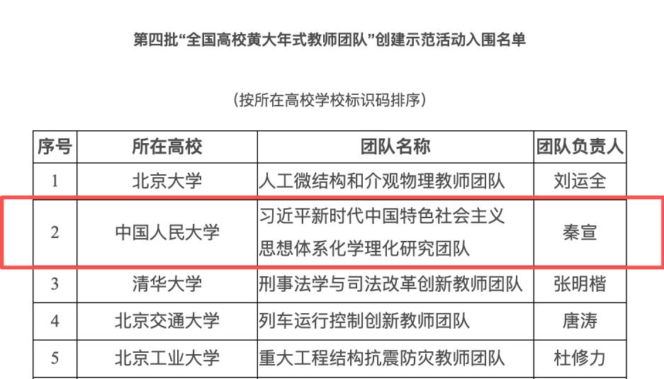 近日,教育部公布第四批“全国高校黄大年式教师团队”创建示范活动入围名单,由中国人民大学教授秦宣担任负责人的“习近平新时代中国特色社会主义思想体系化学理化研究团队”成功入选。这是中国人民大学连续四次入选“全国高校黄大年式教师团队”。 跨学科的协同优势、老中青结合的传承力量、扎实的学