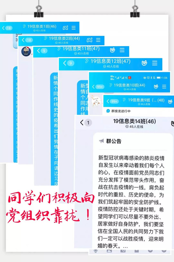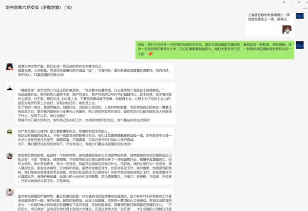 开展线上党组织生活,围绕战疫中的党员先进性展开讨论,身在湖北的党员写道,“我的父亲正在基层从事抗“疫”宣传工作,我也要不负党员担当,传播正能量”。