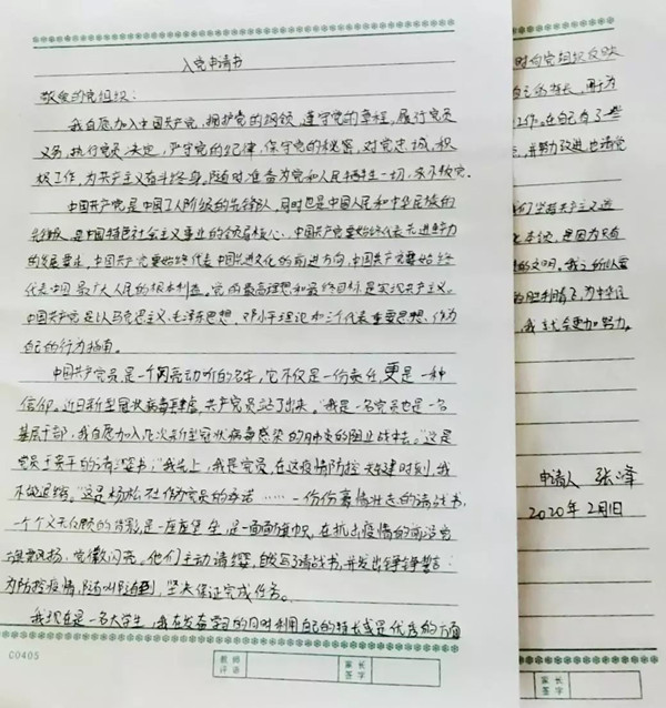 通过20个班级群向全体学生再一次开展入党启蒙教育。2月1日刚满18岁的张峰同学,郑重提交了自己的入党申请书,“我之所以要加入中国共产党,是因为我要为中华民族的强大出一份微薄而坚强的力量”。